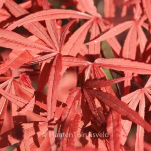 Sorte mit sehr feinem, schmalen Blatt, hellroter Austrieb. Pflanzenhöhe n. 10 Jahren 250 cm. Die Blattfarbe ist weinrot. Die Blütezeit ist Mai. Diese Pflanze ist winterhart. Anzahl pro Qm : 1. Volksname : Fächer-ahorn . Der japanische Name bedeutet: Roter grosser Bambus Mögliche Alternativen : Acer palmatum ‚Atrolineare‘. Wichtigster Unterschied: wenig Unterschied. Acer palmatum ‚Enkan‘. Wichtigster Unterschied: Acer palmatum ‚Enkan‘ etwas roder von Blatt. Acer palmatum ‚Greenthumb North-Carolina Red‘. Wichtigster Unterschied: wenig Unterschied. Acer palmatum ‚Hupp’s Red Willow‘. Wichtigster Unterschied: wenig Unterschied. Acer palmatum ‚Pung Kill‘. Wichtigster Unterschied: wenig Unterschied. Acer palmatum ‚Red Pygmy‘. Wichtigster Unterschied: Acer palmatum ‚Beni-ohtake‘ etwas roter. Ist anwesend in unsere Pflanzenladen. Bitte sehen Sie im Aktuelle Vorrat.
