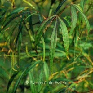 Sehr schmales Blatt, Herbstfarbe gelb/orange-rot. Pflanzenhöhe n. 10 Jahren 250 Zm. Die Blattfarbe ist dunkelgrün. Die Blütezeit ist Mai. Diese Pflanze ist winterhart. Anzahl pro Qm : 1. Volksname : Fächer-ahorn . Der japanische Name bedeutet: Mit goldenen Fäden Mögliche Alternativen : Acer palmatum ‚Ao-shime‘. Wichtigster Unterschied: Acer palmatum ‚Kinshi‘ etwas grover von Blatt. Acer palmatum ‚Koto-no-ito‘. Wichtigster Unterschied: Acer palmatum ‚Koto-no-ito‘ schmaler Blatt. Acer palmatum ‚Linearilobum‘. Wichtigster Unterschied: Acer palmatum ‚Linearilobum‘ schmaler Blatt. Diese Pflanze hat die folgende Auszeichnung: AGM, Award of Garden Merit, 2012. Ist in die Baumschule anwesend, aber muss vorbestellt werden.