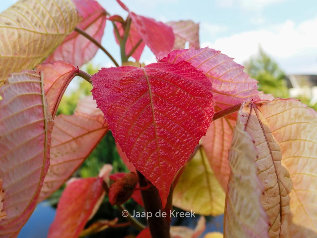 Sommergrüner Strauch; junges Blatt leuchtend lachsrosa. Pflanzenhöhe n. 10 Jahren 2 meter. Die Blütezeit ist Mai – Juni. Diese Pflanze ist nicht sehr winterhart. . Ist anwesend in unsere Pflanzenladen. Bitte sehen Sie im Aktuelle Vorrat. . .