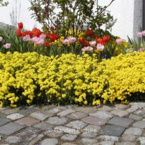 Steinkraut mit dicht behaarten, niederliegenden Trieben. Pflanzenhöhe n. 10 Jahren 15 cm. Die Blütenfarbe ist gelb (leicht duftend). Die Blütezeit ist April – Mai. Diese Pflanze ist winterhart. Anzahl pro Qm : 8. Volksname : Berg-steinkraut . . Nur auf Vorbestellung lieferbar.