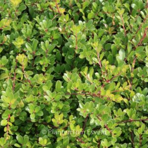 Kriechender, immergrüner Bodendecker; rote Beeren. Pflanzenhöhe n. 10 Jahren 15 cm. Die Blütenfarbe ist rosa. Die Blütezeit ist April. Diese Pflanze ist vollkommen winterhart. Volksname : Echte bärentraube Mögliche Alternative : Arctostaphylos uva-ursi. Wichtigster Unterschied: Arctostaphylos uva-ursi ‚Radiant‘ etwas gesunder. Ist anwesend in unsere Pflanzenladen. Bitte sehen Sie im Aktuelle Vorrat.