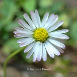Gänseblümchen;verbreitete, essbare Wiesenblume. Pflanzenhöhe n. 10 Jahren 10 cm. Die Blütenfarbe ist weiss mit gelber Mitte. Die Blütezeit ist März – November. Diese Pflanze ist vollkommen winterhart. Anzahl pro Qm : 11. . Nur auf Vorbestellung lieferbar.