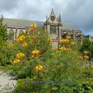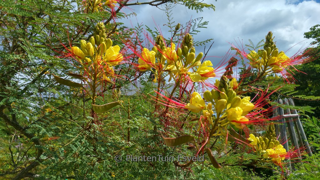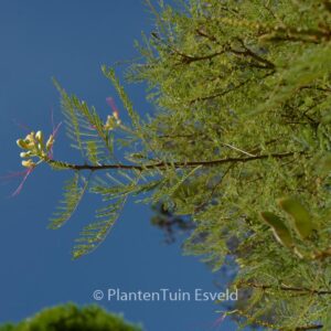 Sehr dekorative, mediterrane Kübelpflanze!. Pflanzenhöhe n. 10 Jahren 3 meter. Die Blütenfarbe ist gelb/rot. Die Blütezeit ist Mai – Juli. Diese Pflanze ist nicht sehr winterhart. Volksname : Paradiesvogelbusch . . Nur auf Vorbestellung lieferbar.