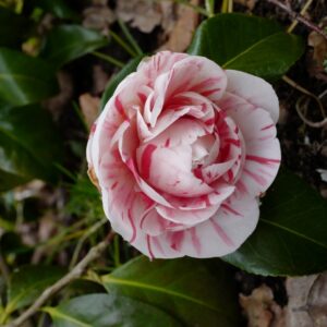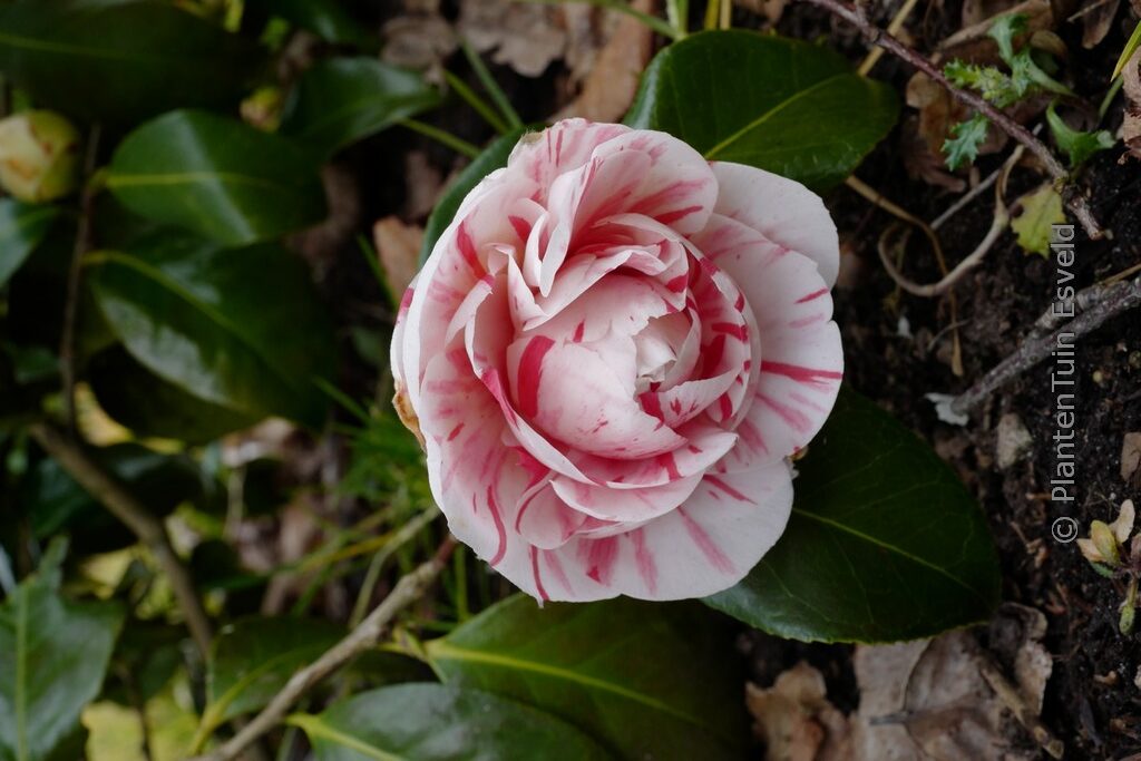 Gefüllte Blüten m. hübscher Streifenzeichnung. Pflanzenhöhe n. 10 Jahren 2 meter. Die Blütenfarbe ist weiss m. feinen roten Streifen. Die Blütezeit ist März – April. Diese Pflanze ist winterhart. Volksname : Kamelie . Ist anwesend in unsere Pflanzenladen. Bitte sehen Sie im Aktuelle Vorrat.