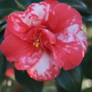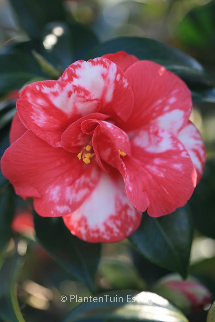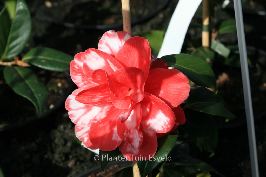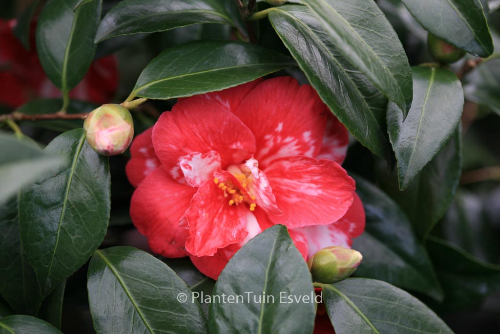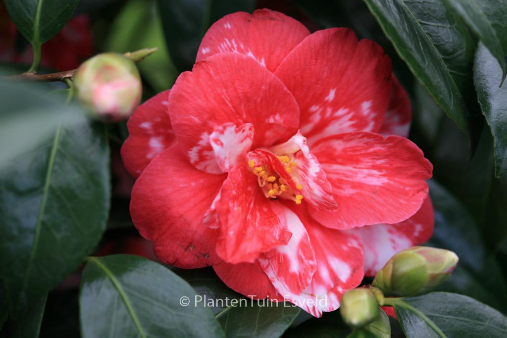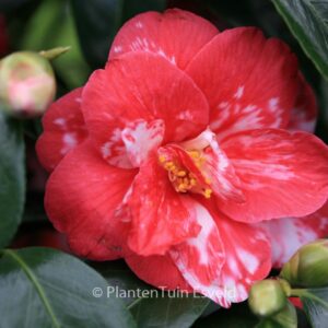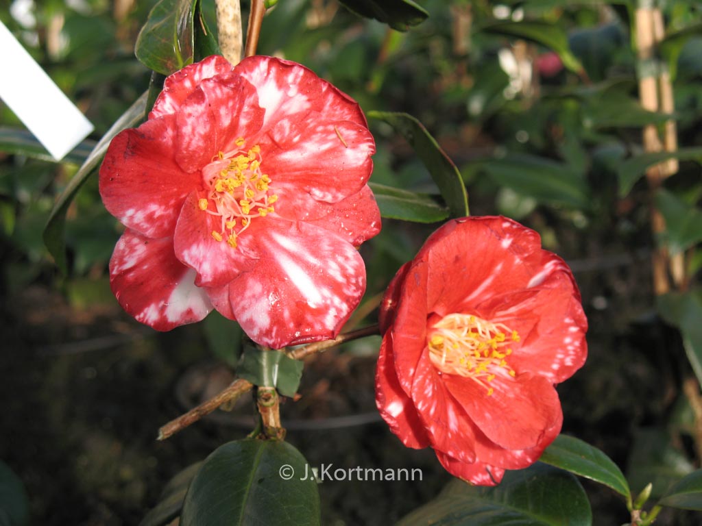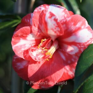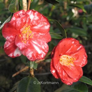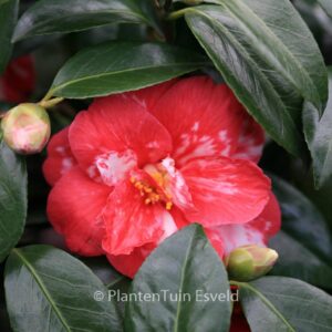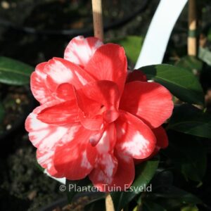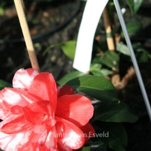 Marmorierte bis gefleckte, halbgefüllte Blüten. Pflanzenhöhe n. 10 Jahren 1,5 m. Die Blütenfarbe ist rot mit weissen Flecken. Die Blütezeit ist Februar – März. Diese Pflanze ist nicht sehr winterhart. Anzahl pro Qm : 1. Volksname : Kamelie . Ist anwesend in unsere Pflanzenladen. Bitte sehen Sie im Aktuelle Vorrat.