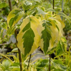 Sehr gute, wüchsige gelbpanaschierte Kreuzung. Pflanzenhöhe n. 10 Jahren 6 meter. Die Blütenfarbe ist weiss. Die Blütezeit ist Mai – Juni. Diese Pflanze ist vollkommen winterhart. Anzahl pro Qm : 1. Volksname : Hartriegel . . Nur auf Vorbestellung lieferbar.