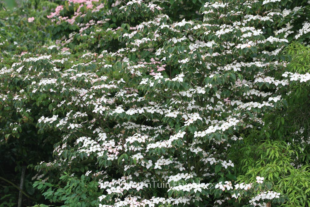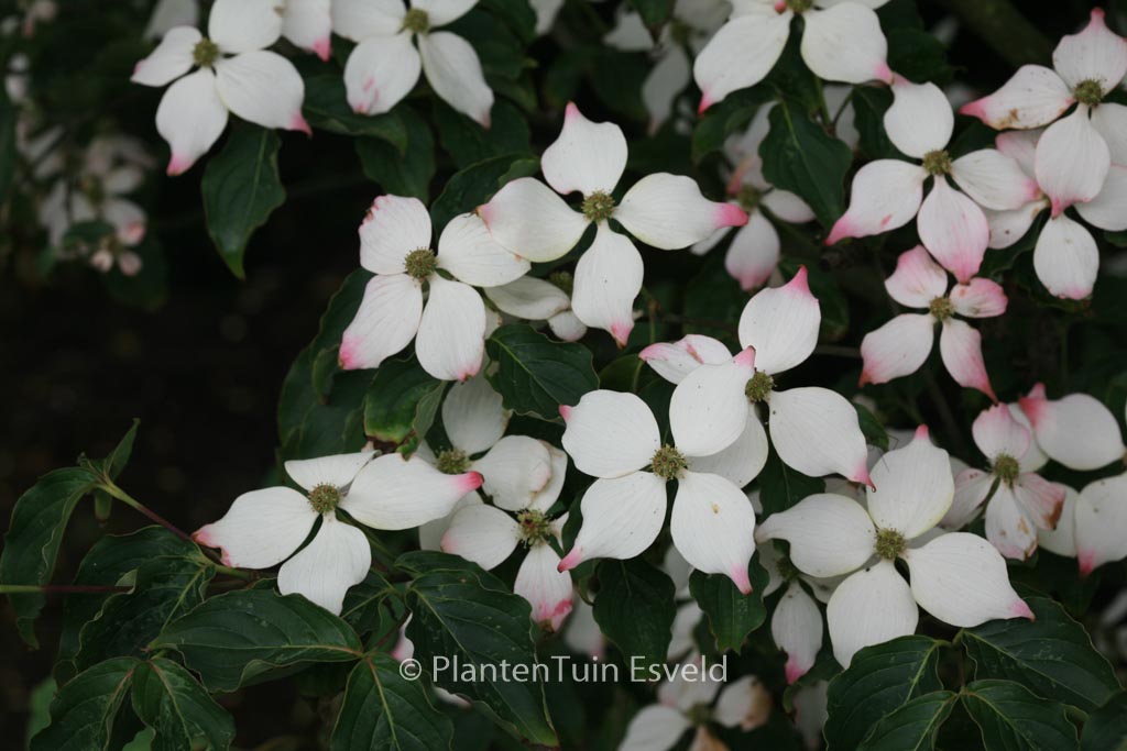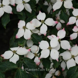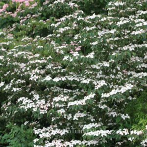 Dichter, runder Habitus; Blüten und Früchte gross. Pflanzenhöhe n. 10 Jahren 3 Meter. Die Blütenfarbe ist erst weiss, später rosa. Die Blütezeit ist Mai – Juni. Diese Pflanze ist winterhart. Anzahl pro Qm : 1. Volksname : Blumen-hartriegel . . Nur auf Vorbestellung lieferbar.