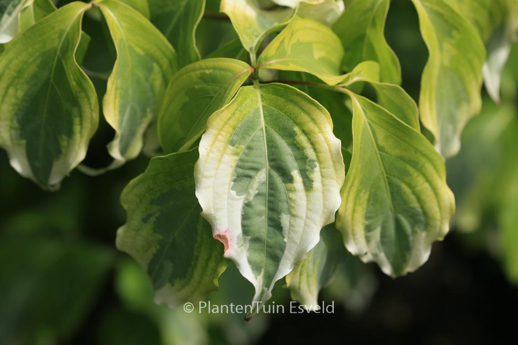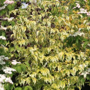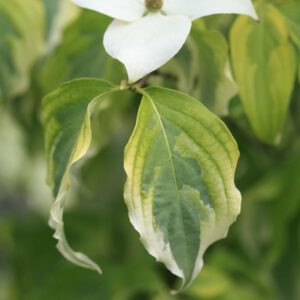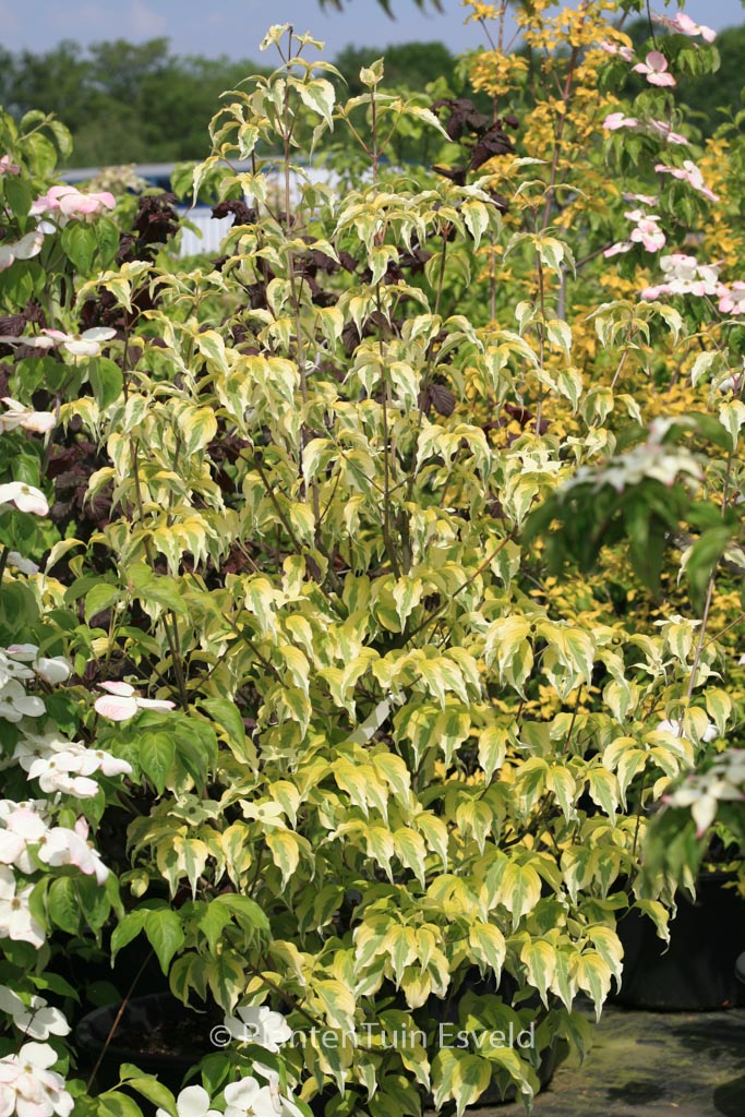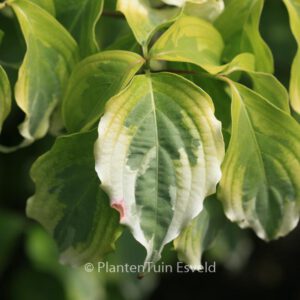 Feine cremegelbe Panaschierung; aufrechter Wuchs; Herbstfarbe. Pflanzenhöhe n. 10 Jahren 2,5 meter. Die Blütenfarbe ist weiss. Die Blütezeit ist Mai – Juni. Diese Pflanze ist winterhart. Volksname : Blumen-hartriegel . . Nur auf Vorbestellung lieferbar.