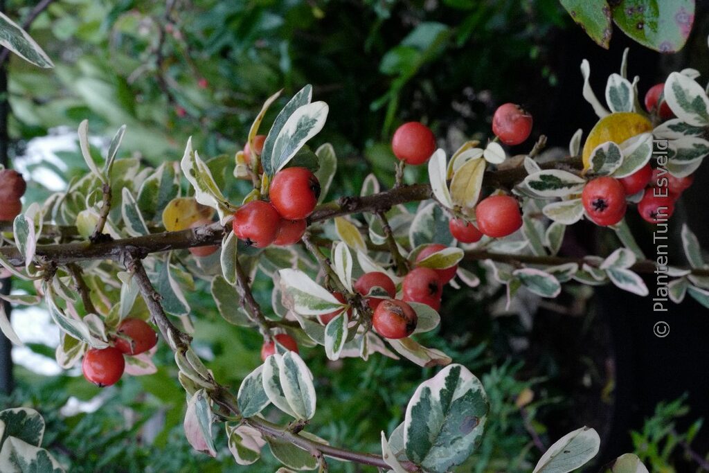 Bodendeckende, weissbunte Selektion mit roten Beeren. Pflanzenhöhe n. 10 Jahren 30 cm. Die Blütenfarbe ist weiss. Die Blütezeit ist Mai – Juni. Diese Pflanze ist winterhart. Volksname : Zwergmispel, felsenmispel . Diese Pflanze hat die folgende Auszeichnung: AGM, Award of Garden Merit, 2012. . Nur auf Vorbestellung lieferbar.