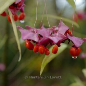 Schmalblättrige Formaus China; dekorative Früchte. Pflanzenhöhe n. 10 Jahren 3 meter. Die Blütenfarbe ist rosarot. Die Blütezeit ist April – Juni. Diese Pflanze ist winterhart. Volksname : Spindelstrauch . . Nur auf Vorbestellung lieferbar.