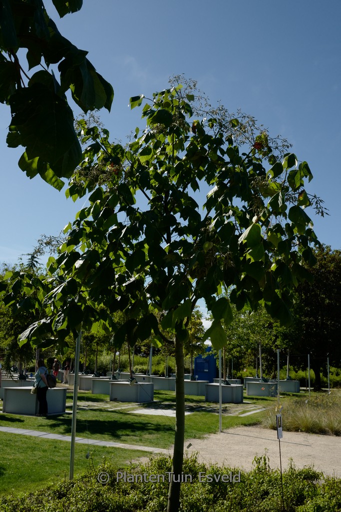 Tropisch anmutender Baum mit grossem Blatt. Pflanzenhöhe n. 10 Jahren 5 meter. Die Blütenfarbe ist gelbgr&uum. Die Blütezeit ist Mai – Juni. Diese Pflanze ist nicht sehr winterhart. . Ist anwesend in unsere Pflanzenladen. Bitte sehen Sie im Aktuelle Vorrat.