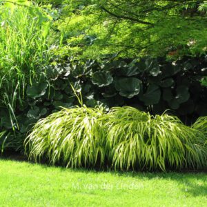 Japan-Goldbandgras; intensiv gelblich leuchtende Blätter. Pflanzenhöhe rund 40 cm. Die Blütenfarbe ist grünlich. Die Blütezeit ist Juli – August. Diese Pflanze ist winterhart. Anzahl pro Qm : 7. Volksname : Japanisches waldgras . . Nur auf Vorbestellung lieferbar.