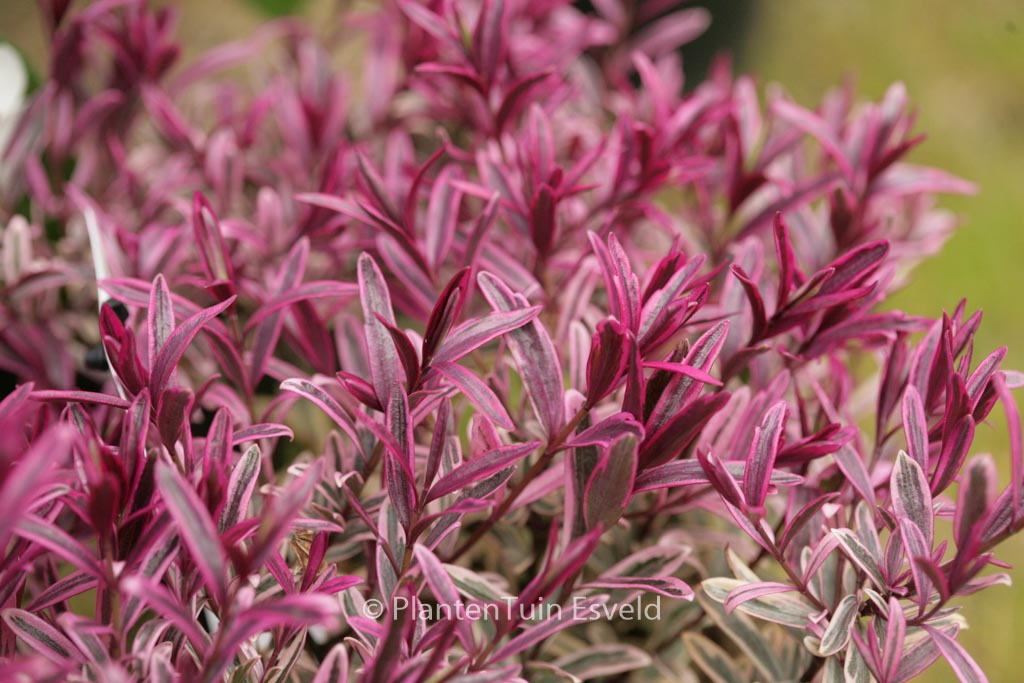 Blatt creme-panaschiert;neuer Austrieb rosa und rotviolett. Pflanzenhöhe n. 10 Jahren 50 cm. Die Blütenfarbe ist lila. Die Blütezeit ist Juli – September. Diese Pflanze ist nicht sehr winterhart. Volksname : Strauchveronika . Ist anwesend in unsere Pflanzenladen. Bitte sehen Sie im Aktuelle Vorrat.