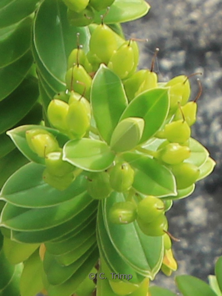 Wuchs rund u. kompakt; Blatt dunkel mit gelbem Rand. Pflanzenhöhe n. 10 Jahren 50 cm. Die Blütenfarbe ist lila nach weiss. Die Blütezeit ist Mai – Juni. Diese Pflanze ist nicht sehr winterhart. Volksname : Strauchveronika . Diese Pflanze hat die folgende Auszeichnung: AGM, Award of Garden Merit, 2002. . Nur auf Vorbestellung lieferbar.