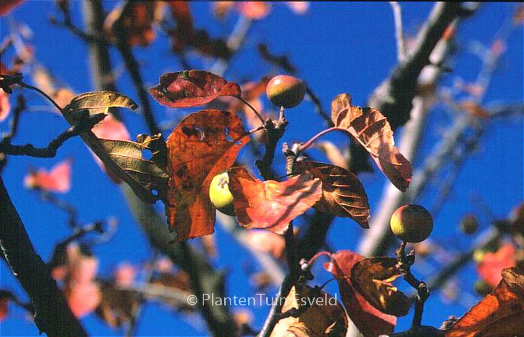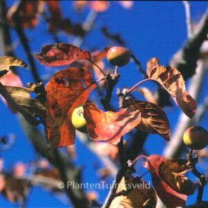 Blatt im Austrieb fast weiss; allerschönste Herbstfarben. Pflanzenhöhe n. 10 Jahren 6 meter. Die Blütenfarbe ist weiss. Die Blütezeit ist Mai. Diese Pflanze ist vollkommen winterhart. Anzahl pro Qm : 1. Volksname : Wollapfel . . Nur auf Vorbestellung lieferbar.