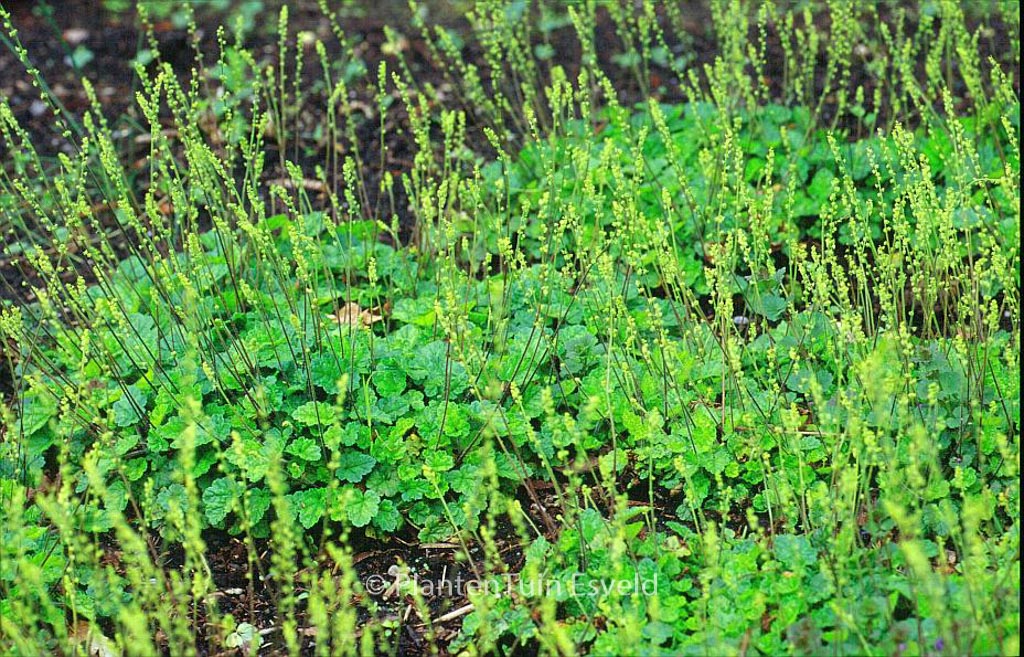 Gedrungener als Tiarella;wintergrünes, krauses Blatt. Pflanzenhöhe rund 25 cm. Die Blütenfarbe ist grünlich-gelb. Die Blütezeit ist April – Juni. Diese Pflanze ist vollkommen winterhart. Anzahl pro Qm : 9. Volksname : Bischofskappe . . Nur auf Vorbestellung lieferbar.