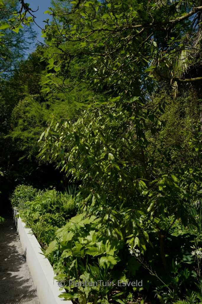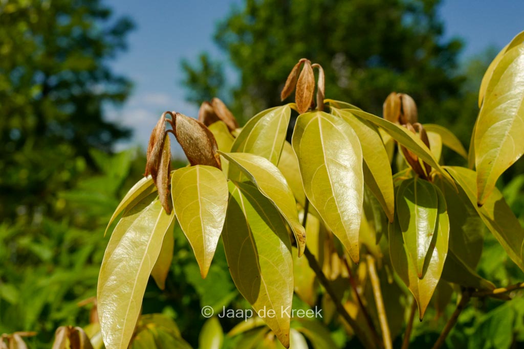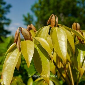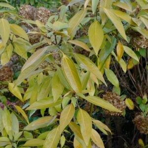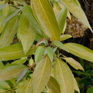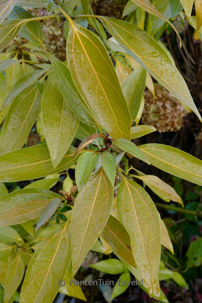 Japanischer Lorbeer, neuerAustrieb goldfarben; hängend. Pflanzenhöhe n. 10 Jahren 2 m. Die Blütenfarbe ist cremefarben. Die Blütezeit ist September – Oktober. Diese Pflanze ist nicht sehr winterhart. . . Nur auf Vorbestellung lieferbar.
