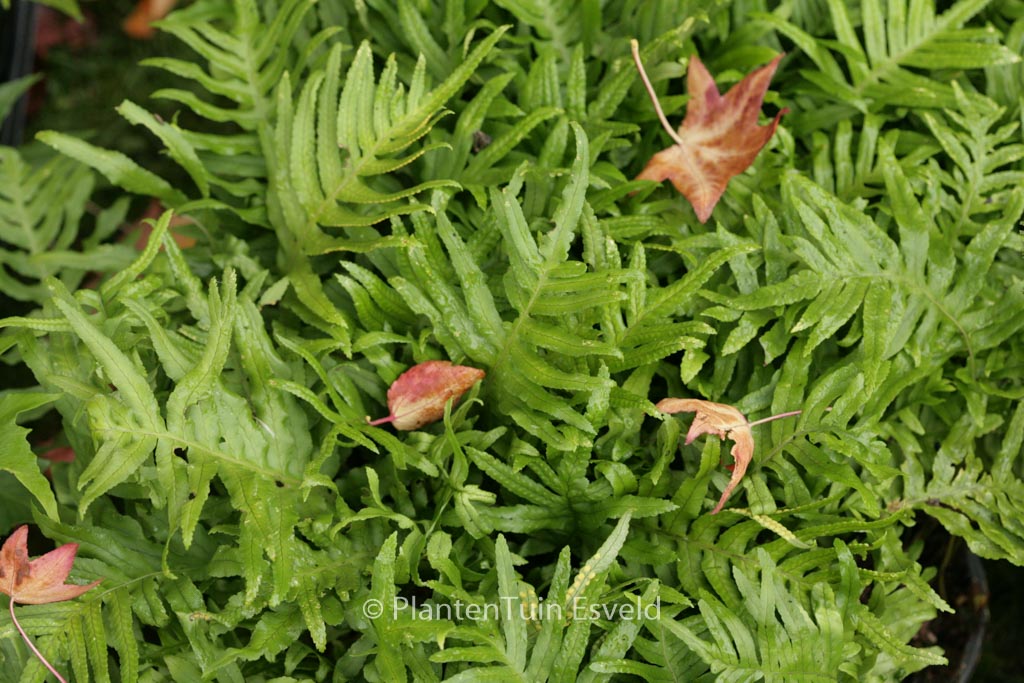Grosser Tüpfelfarn;breite, geschwungene Wedel. Pflanzenhöhe n. 10 Jahren 40 cm. Diese Pflanze ist winterhart. Anzahl pro Qm : 5. . Nur auf Vorbestellung lieferbar.