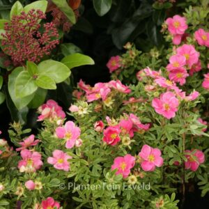 Blüten locker halbgefüllt; kompakt, dichtverzweigt. Pflanzenhöhe n. 10 Jahren 50 cm. Die Blütenfarbe ist ein frisches, klares Rosa. Die Blütezeit ist Juni – Oktober. Diese Pflanze ist winterhart. Anzahl pro Qm : 5. Volksname : Fingerstrauch . Diese Pflanze hat die folgende Auszeichnung: Getuigschrift van Verdienste von der KVBC Niederlande 2009. . Nur auf Vorbestellung lieferbar.
