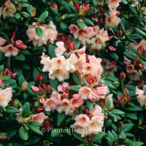 Wardii Hybride; kompakterWuchs, grosse Blüten. Pflanzenhöhe n. 10 Jahren 1,5 m. Die Blütenfarbe ist apricot; in der Knospe rosa. Die Blütezeit ist Mai. Diese Pflanze ist winterhart. Anzahl pro Qm : 2. . . Nur auf Vorbestellung lieferbar.